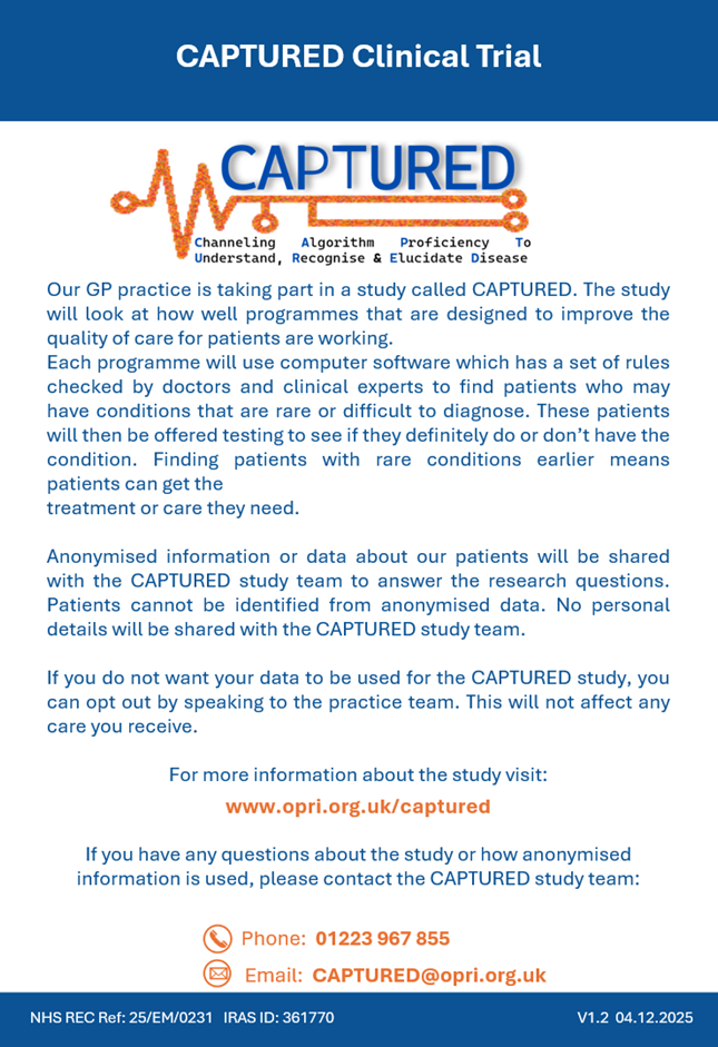 Please note this list is not exhaustive and you may be invited by us to studies not included above. If you are contacted about a study and are unsure about its authenticity please contact your surgery.